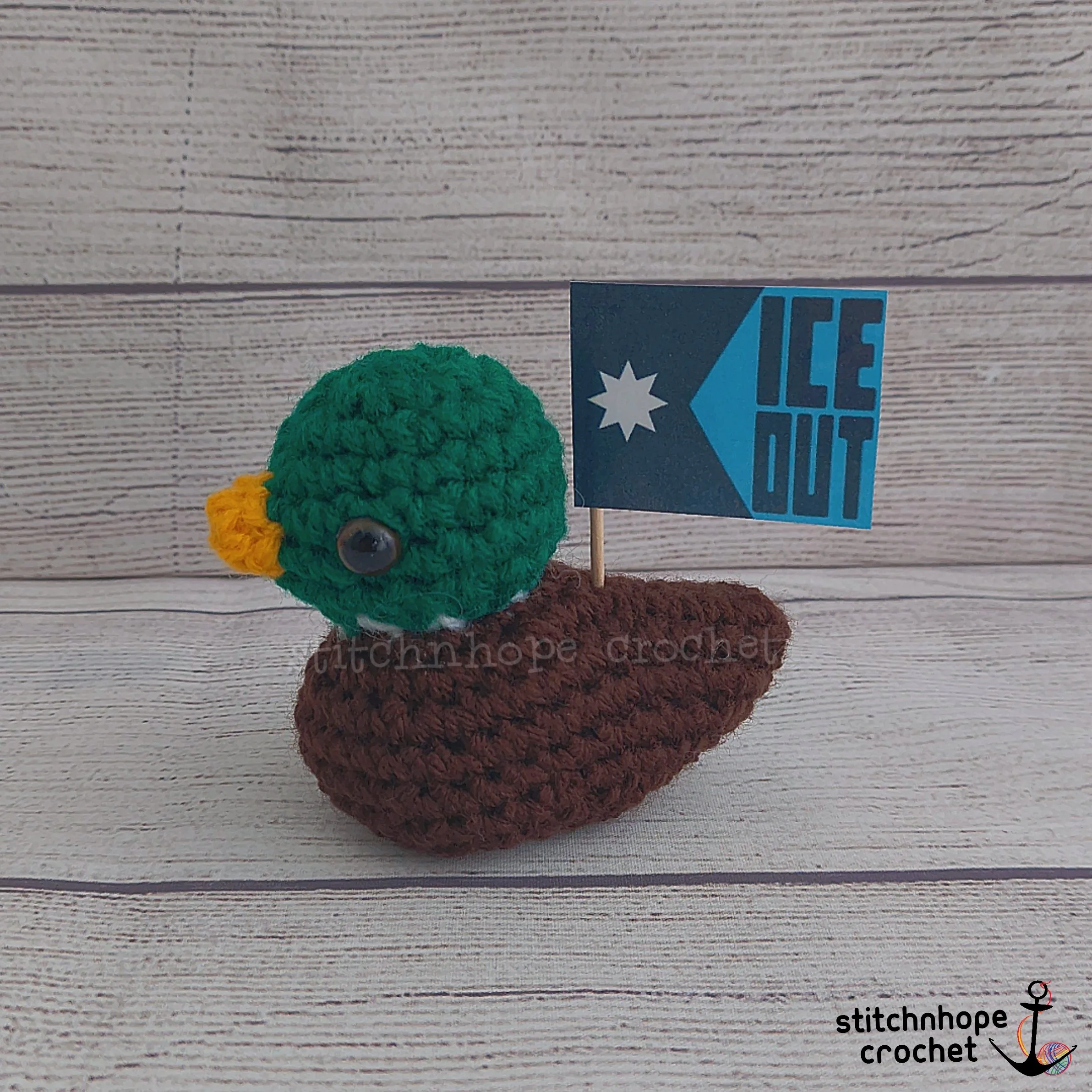 The duck is about 3 inches long and comes with an “Ice Out” Minnesota state flag.